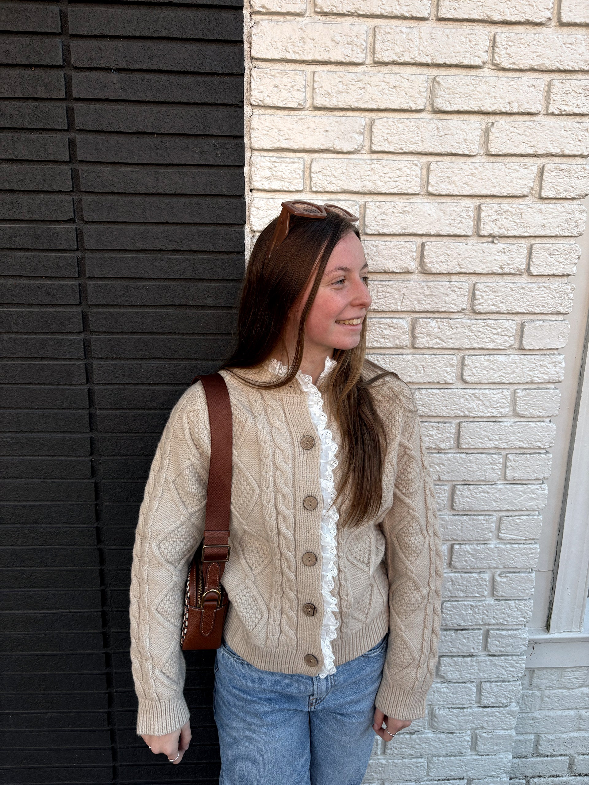 The Christine Cardigan is perfect for adding a touch of elegance to your wardrobe. Its eyelet trim detail and cable knit design create a sophisticated look, while the wooden button accents add a rustic touch. Stay warm and stylish with this must-have cardigan.