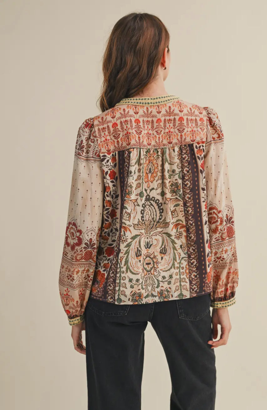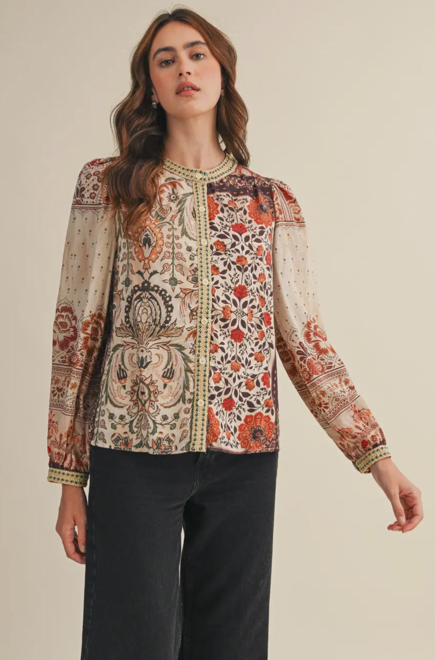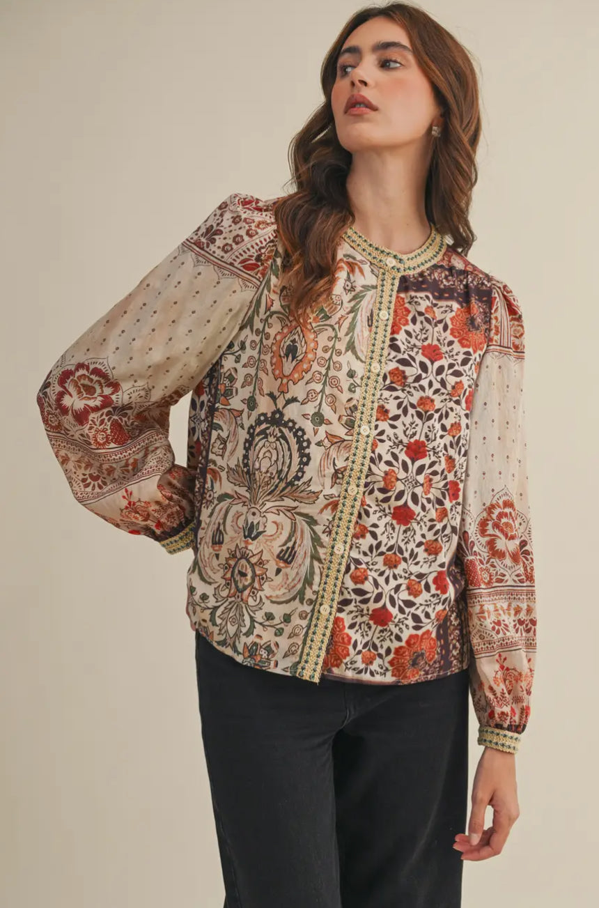 Expertly crafted with a patchwork print and delicate crochet trim, the Hazel Top is a must-have for any fashion-forward wardrobe. Featuring a button-down front and long puff sleeves with buttoned cuffs, this top offers both style and versatility. The relaxed bodice and lining provide all-day comfort.