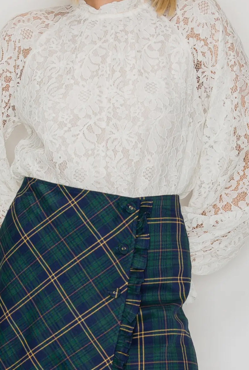 This Holiday Tartan Skort features a classic navy and green tartan design, perfect for the holiday season. With added ruffle and button detailing, it adds a touch of sophistication to any outfit. Made with high quality material, it offers both style and comfort.
