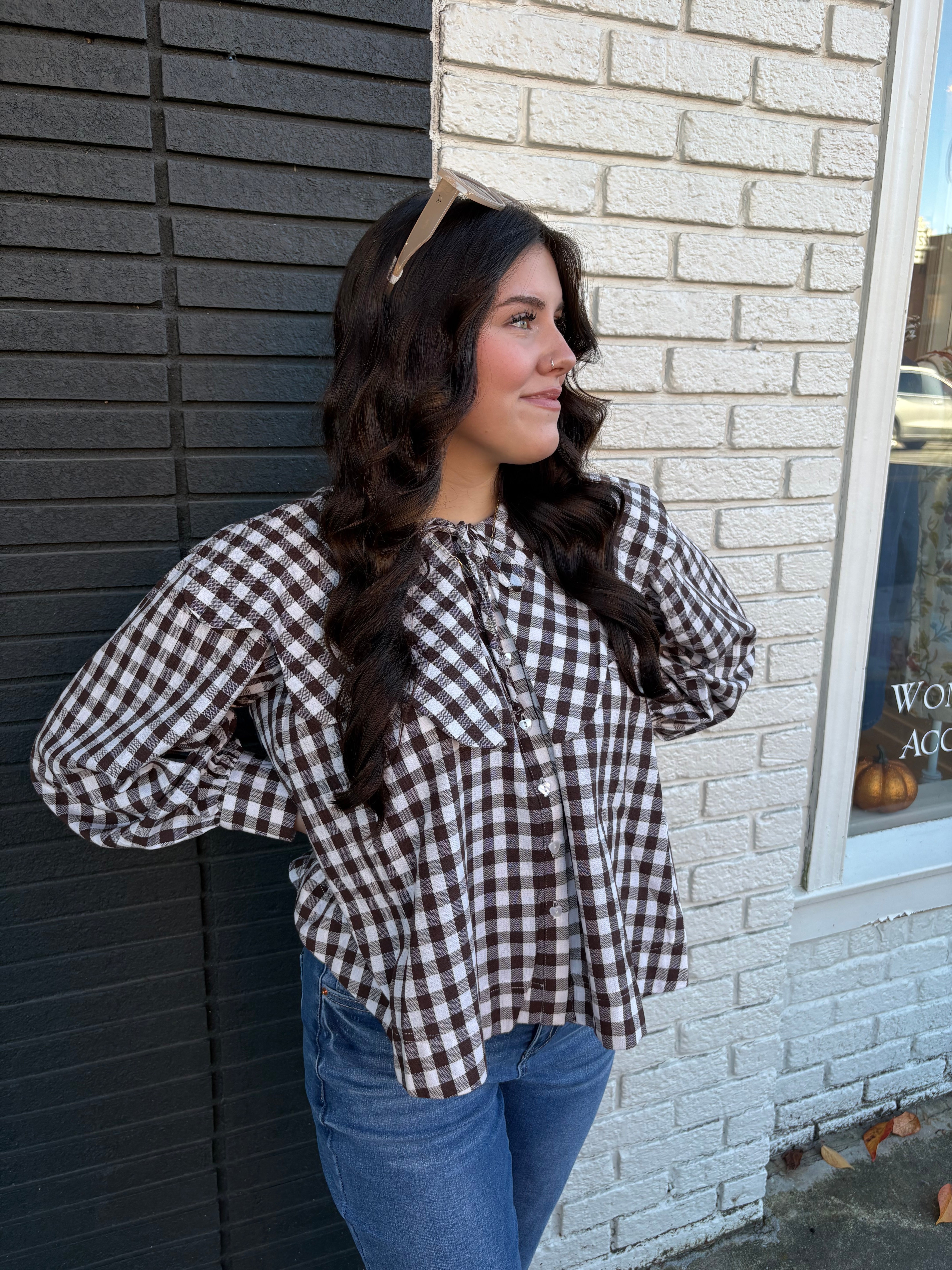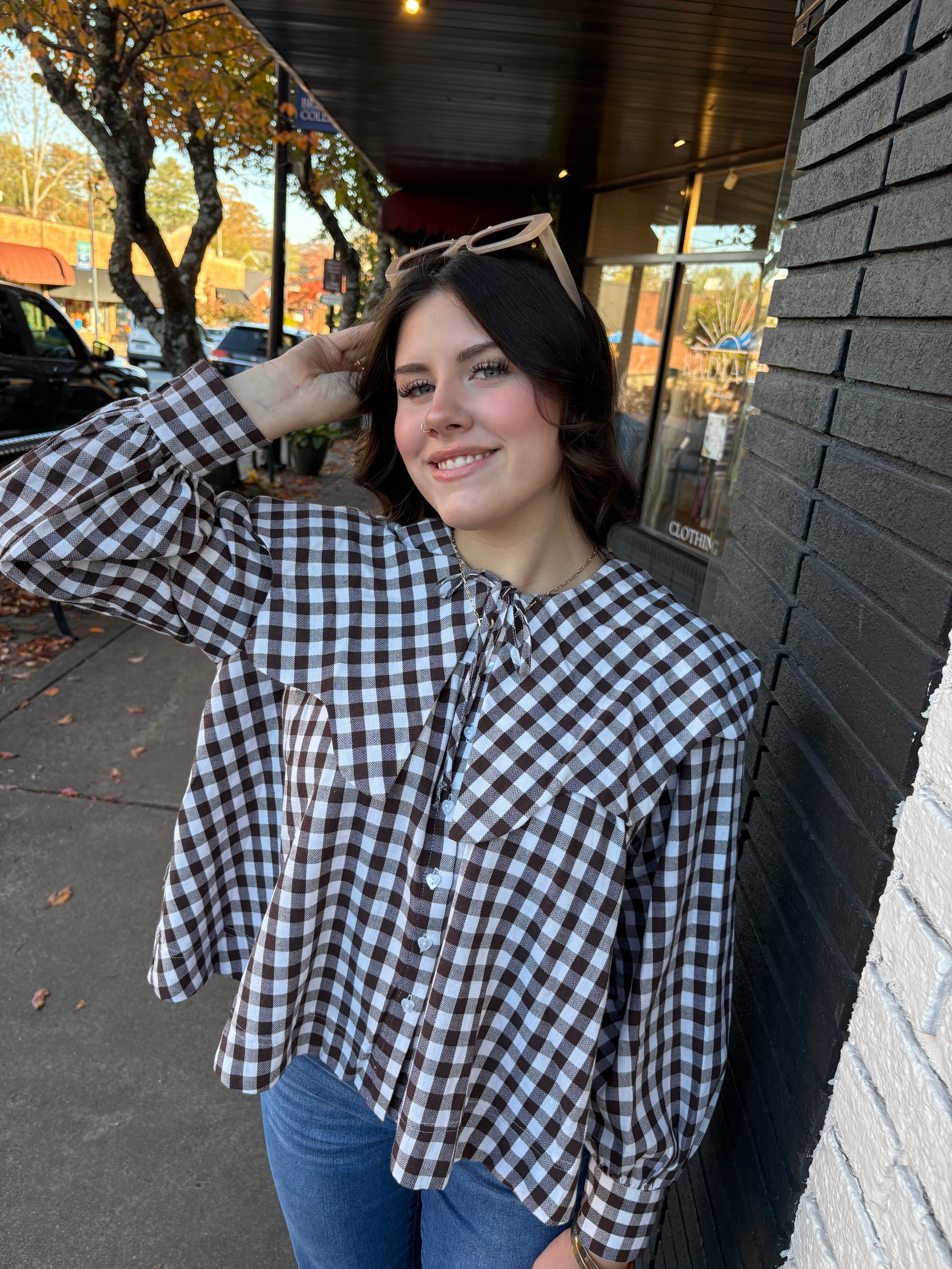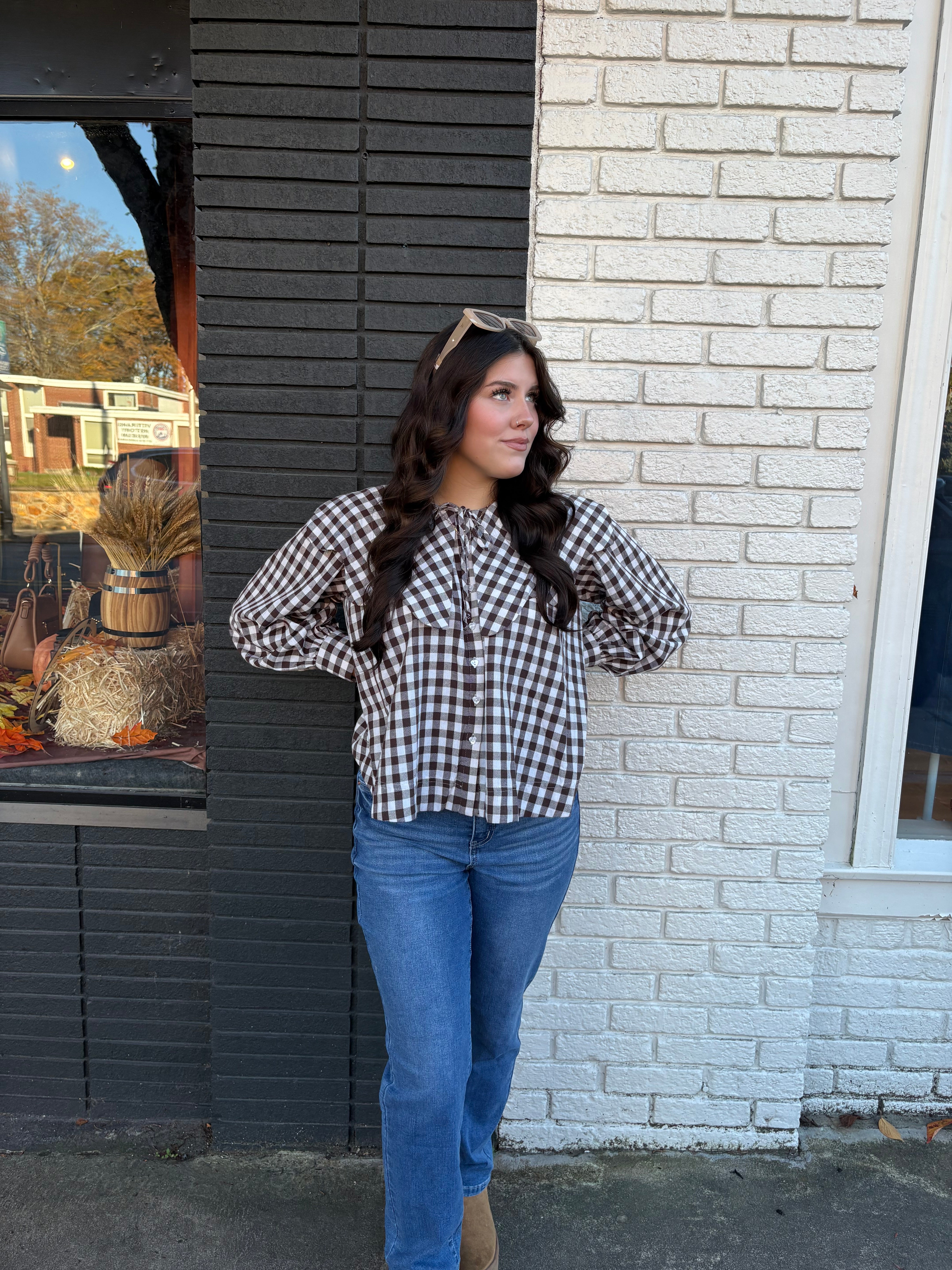 Introducing the Mayflower Top, your new go-to for a touch of classic elegance. With its charming gingham print and delicate scallop collar, this button-up shirt offers a timeless look with a modern twist. Perfect for any occasion, this top will elevate any outfit with its chic and sophisticated style.