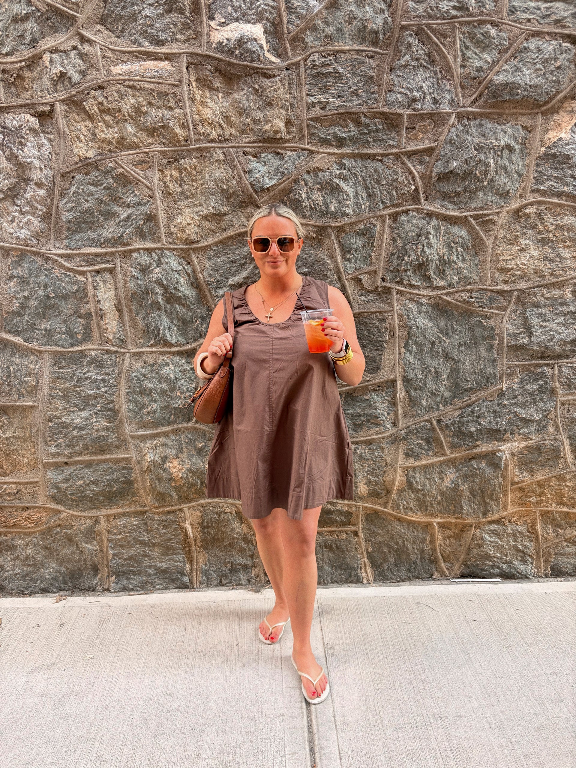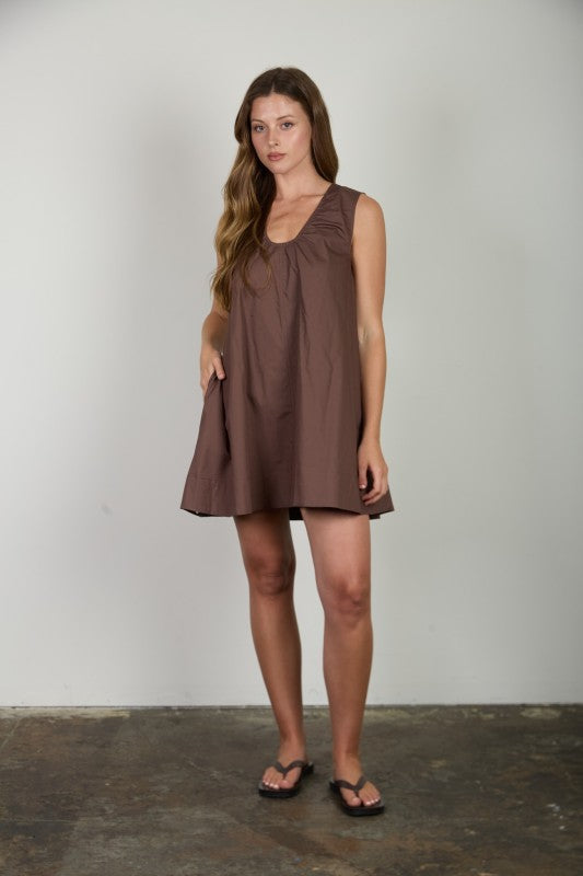 The River Dress features a sleeveless design and a gathered neck detail, providing a blend of comfort and style. Its mini swing silhouette enhances freedom of movement, while the inclusion of pockets offers practical functionality. This dress is ideal for casual outings or relaxed gatherings.