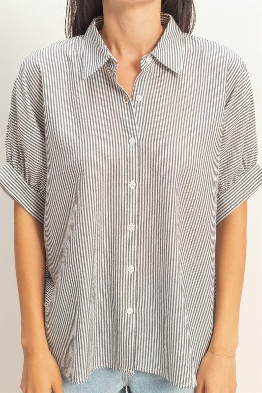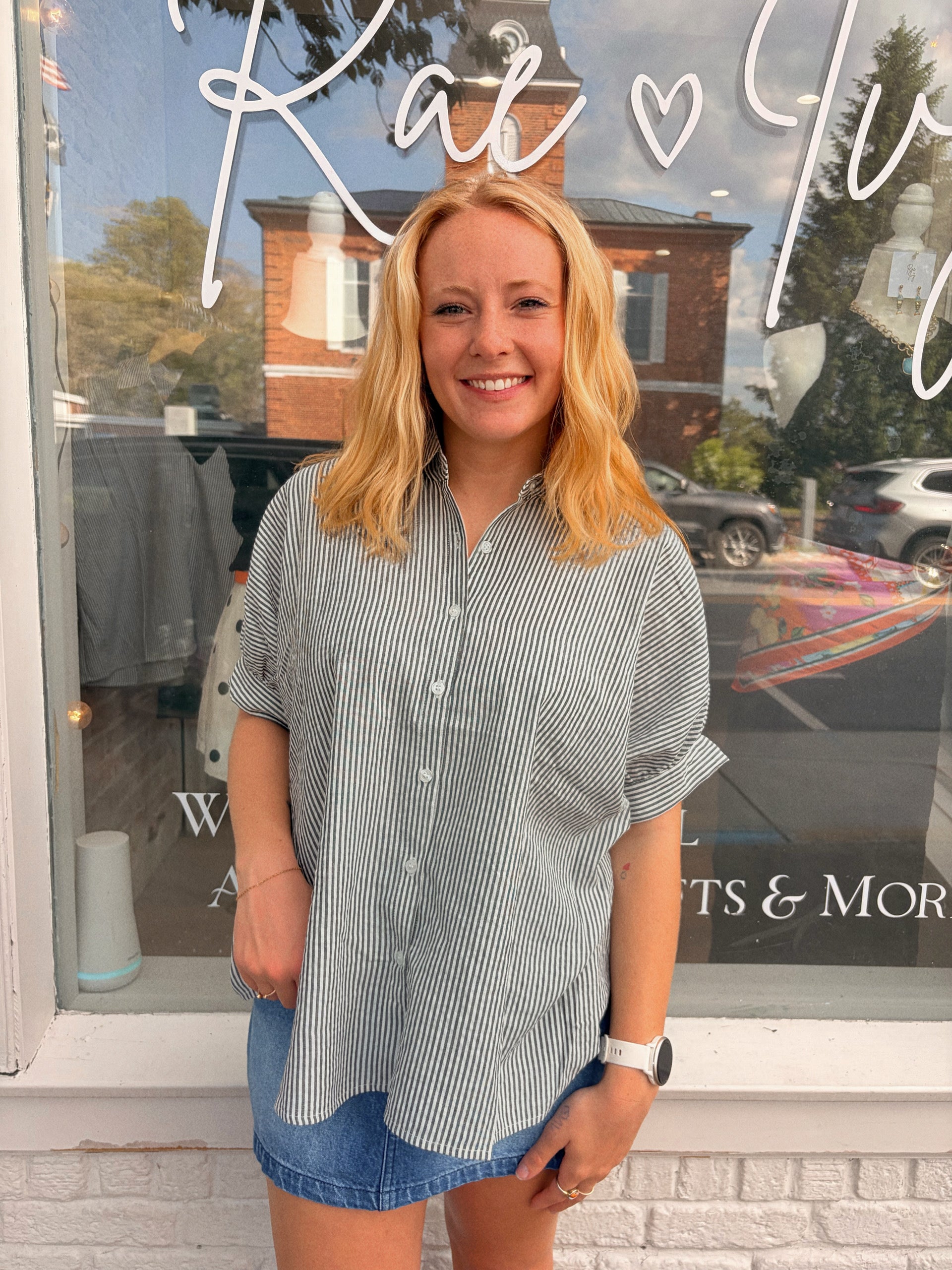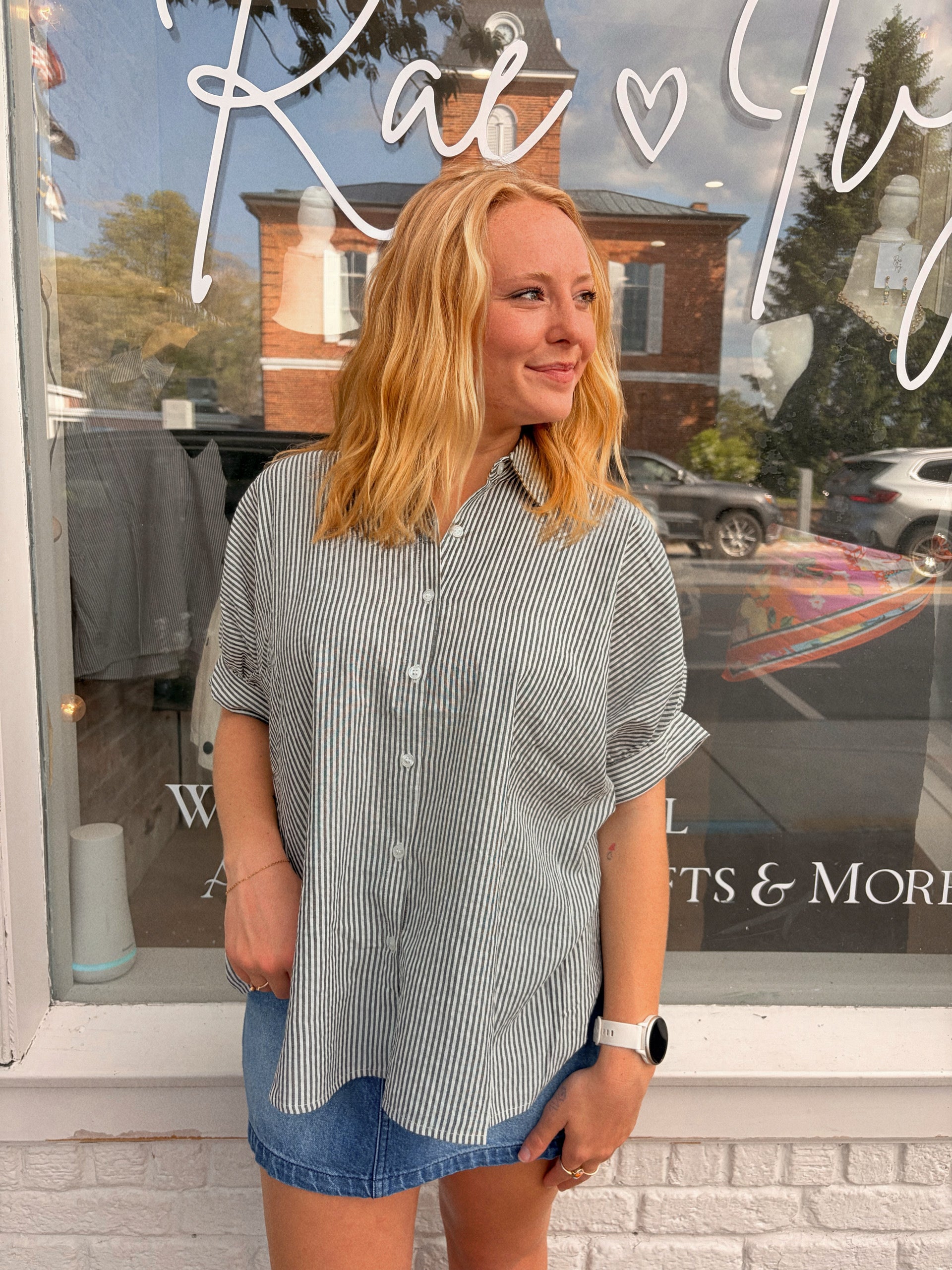 The Sylvie Top features a stripe pattern, a button-up collar, and short sleeves, providing a versatile addition to any wardrobe. Its oversized fit allows for enhanced comfort and breathability, making it suitable for various occasions. Ideal for layering or standalone wear, it combines style with practicality.