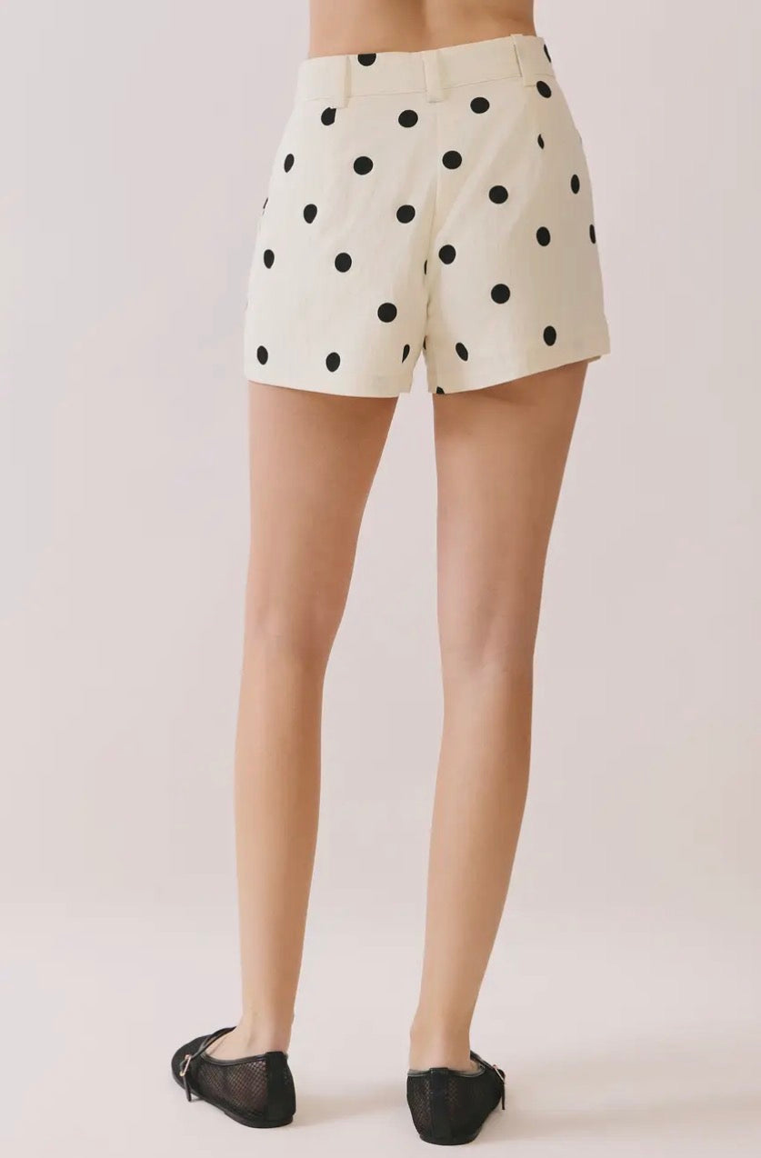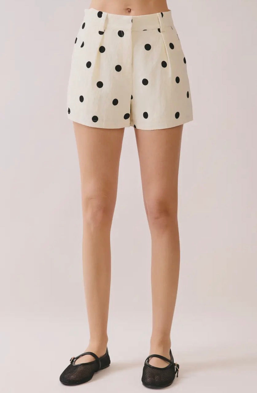The Tiffin Shorts feature a polka dot graphic, combining aesthetics with functionality. The front zip and button closure ensures a secure fit, while subtle front pleats enhance comfort and mobility. Equipped with belt loops and functional pockets, these shorts provide practical storage and adjustable styling options.