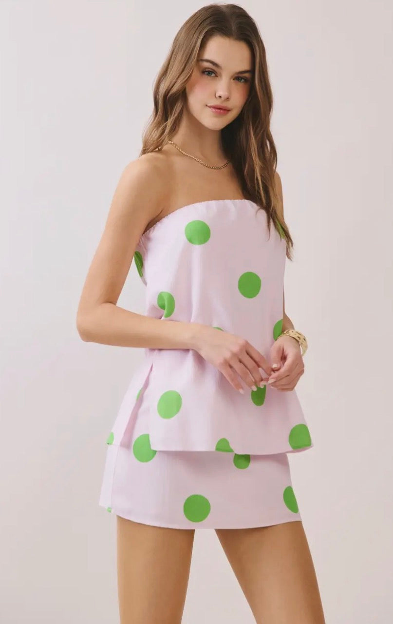 The Tulip Tube Top features a polka dot design with an elasticized strapless fit for comfortable wear. The side slit enhances mobility and adds a touch of style, making it a versatile choice for various occasions. This top is designed for ease of movement while maintaining a fashionable appearance. Pairs perfect with our Tulip Mini Skirt.